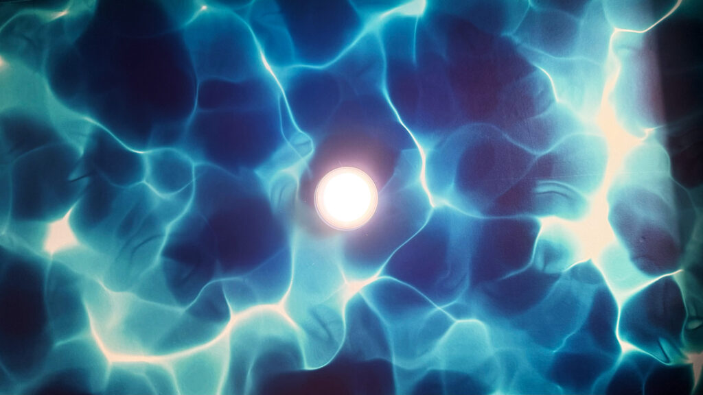 天井には水面をモチーフにした模様を配置し、照明の反射によって幻想的な雰囲気を演出しています。